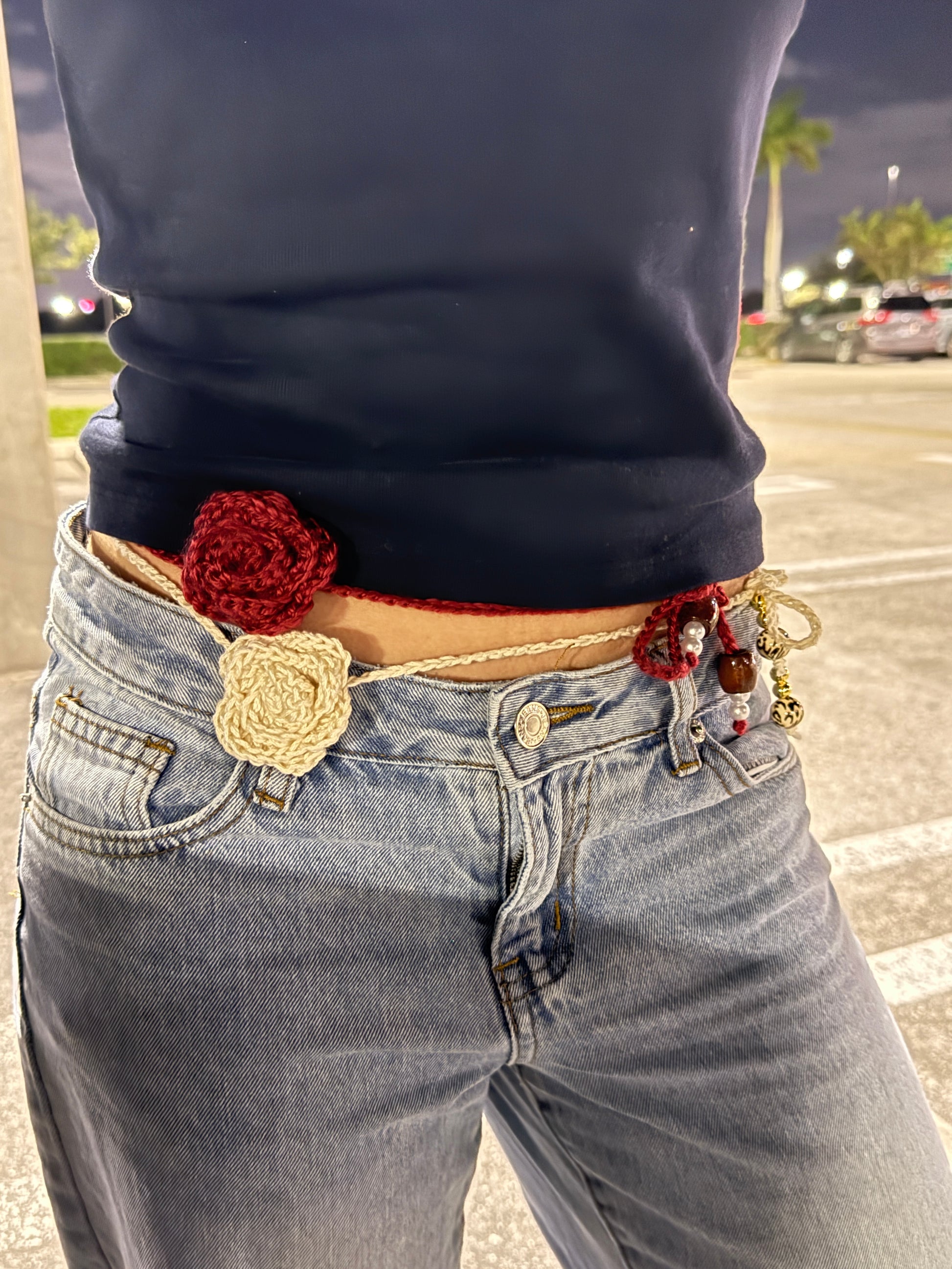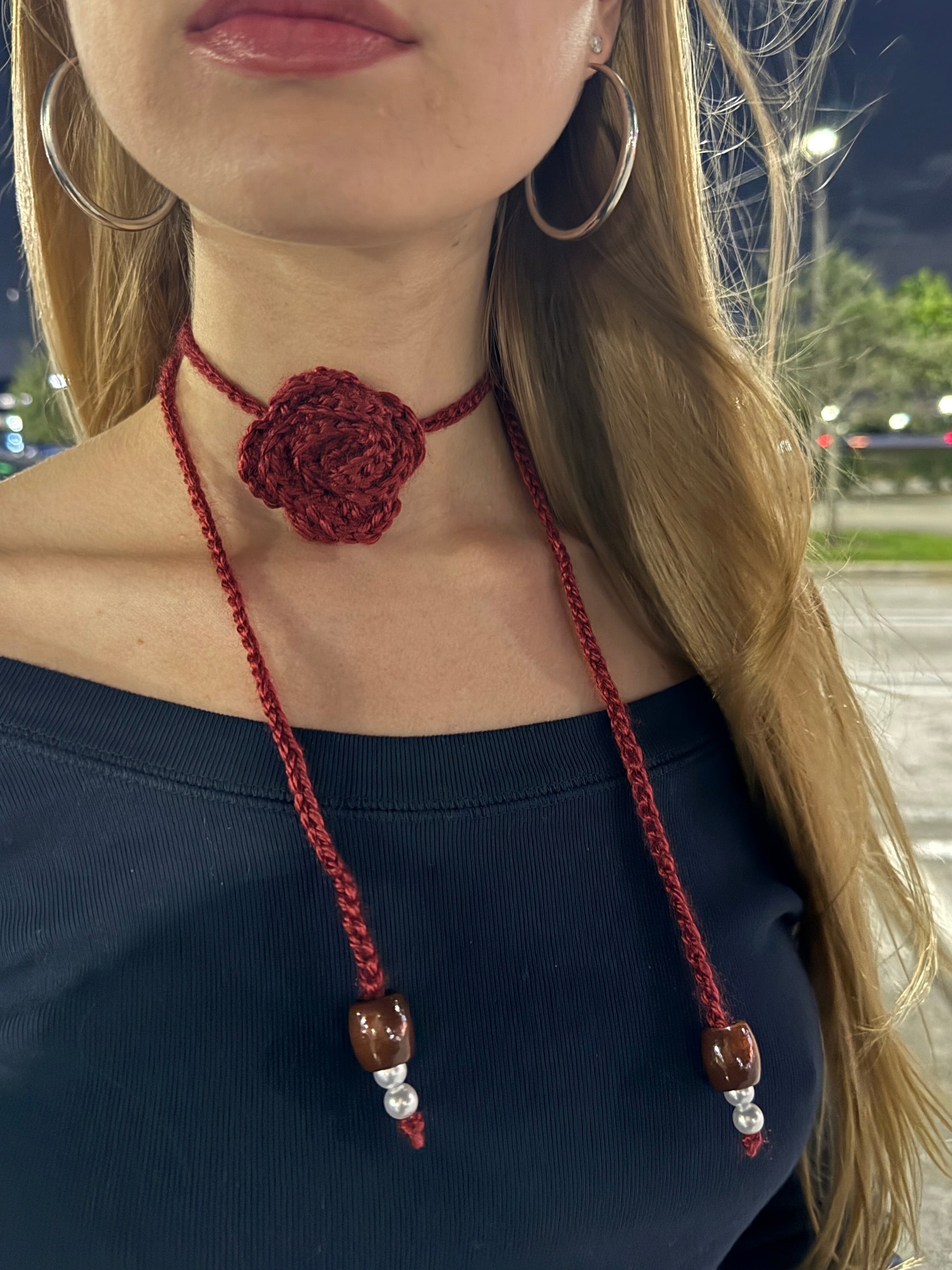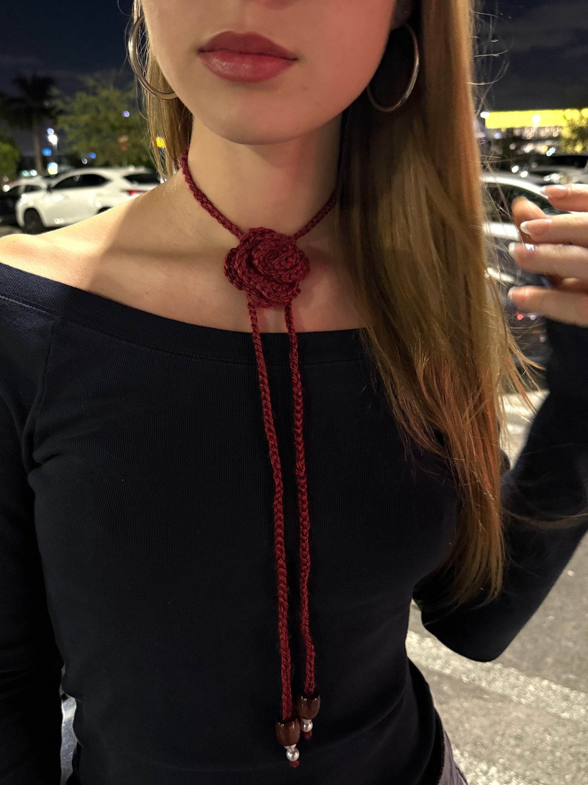 Handmade with love, this chic crochet necktie adds a touch of elegance to any outfit. Featuring a delicate burgundy rosette and wooden accents, it’s the perfect mix of romantic and modern style.