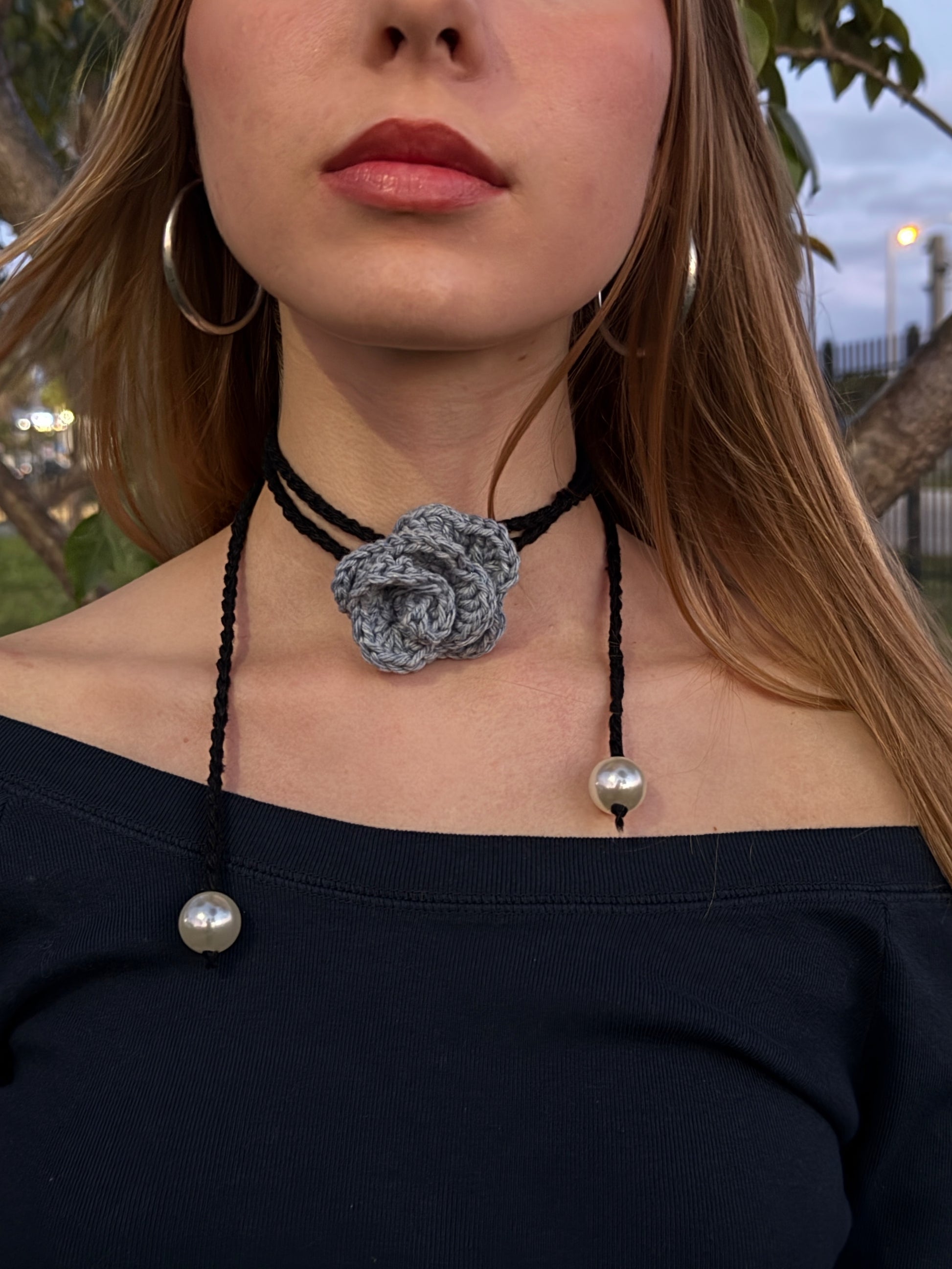 Handmade with love, this chic crochet necktie adds a touch of elegance to any outfit. Featuring a delicate baby blue rosette and pearl accents, it’s the perfect mix of romantic and modern style.